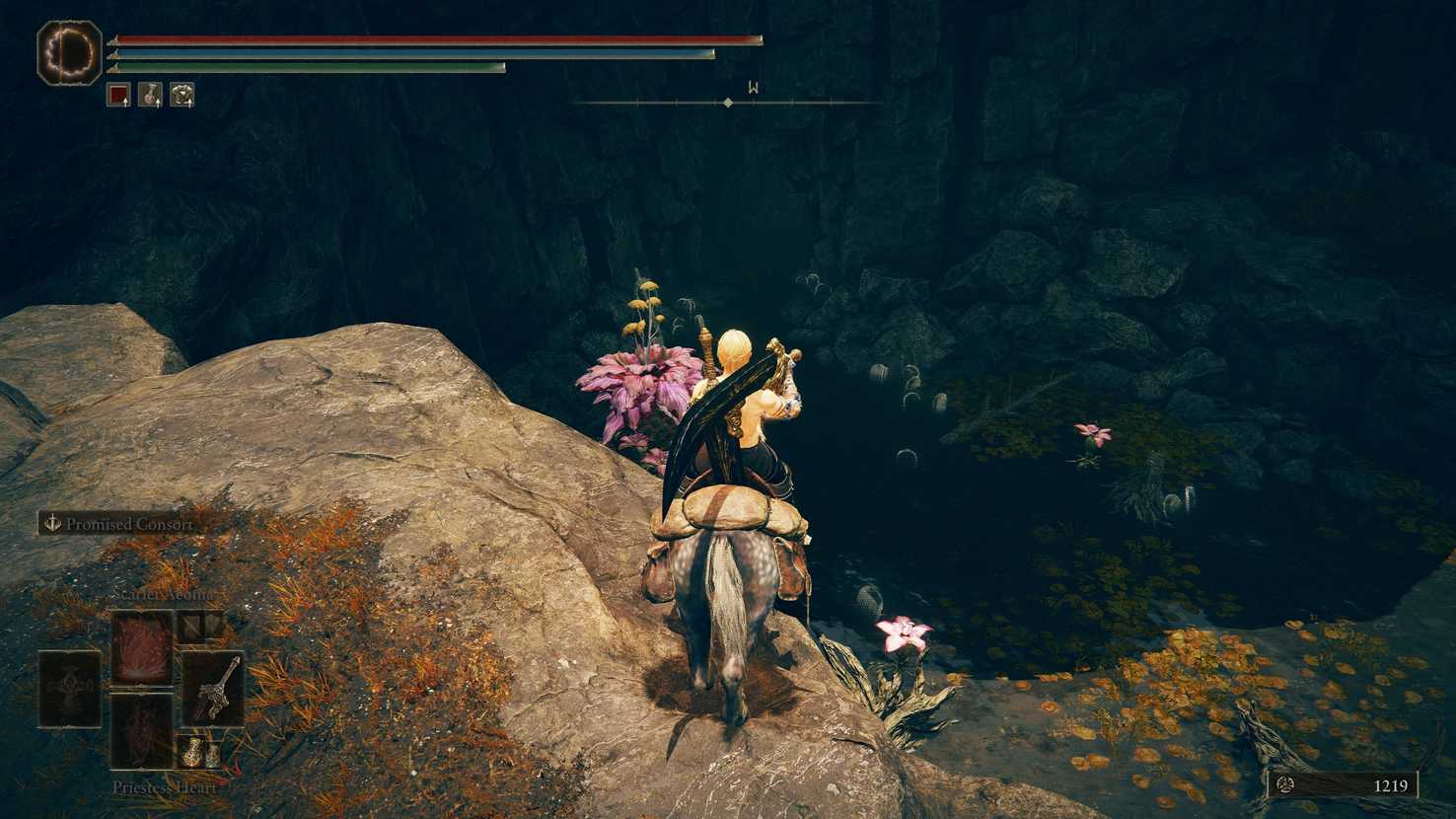 Enter the cave, light your lantern, and climb the rocky ledges on your left. There’s a corpse hanging over the edge above you with a Deep-Purple Lily.