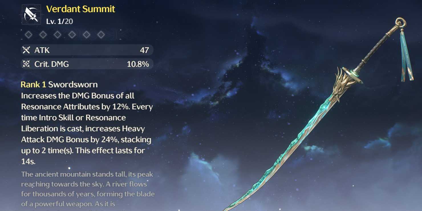 Verdant Summit | Weapon Event Convene | – Increases Resonance attributes damage by 12% – Boosts Heavy Attack damage by 24% when using Resonance Liberation or Intro Skill regularly |